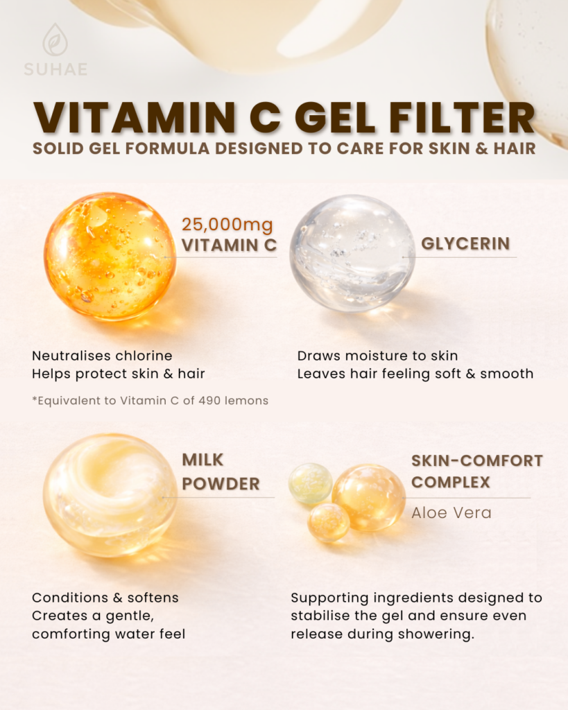25,000mg Vitamin C neutralises chlorine instantly with skin comfort ingredients.