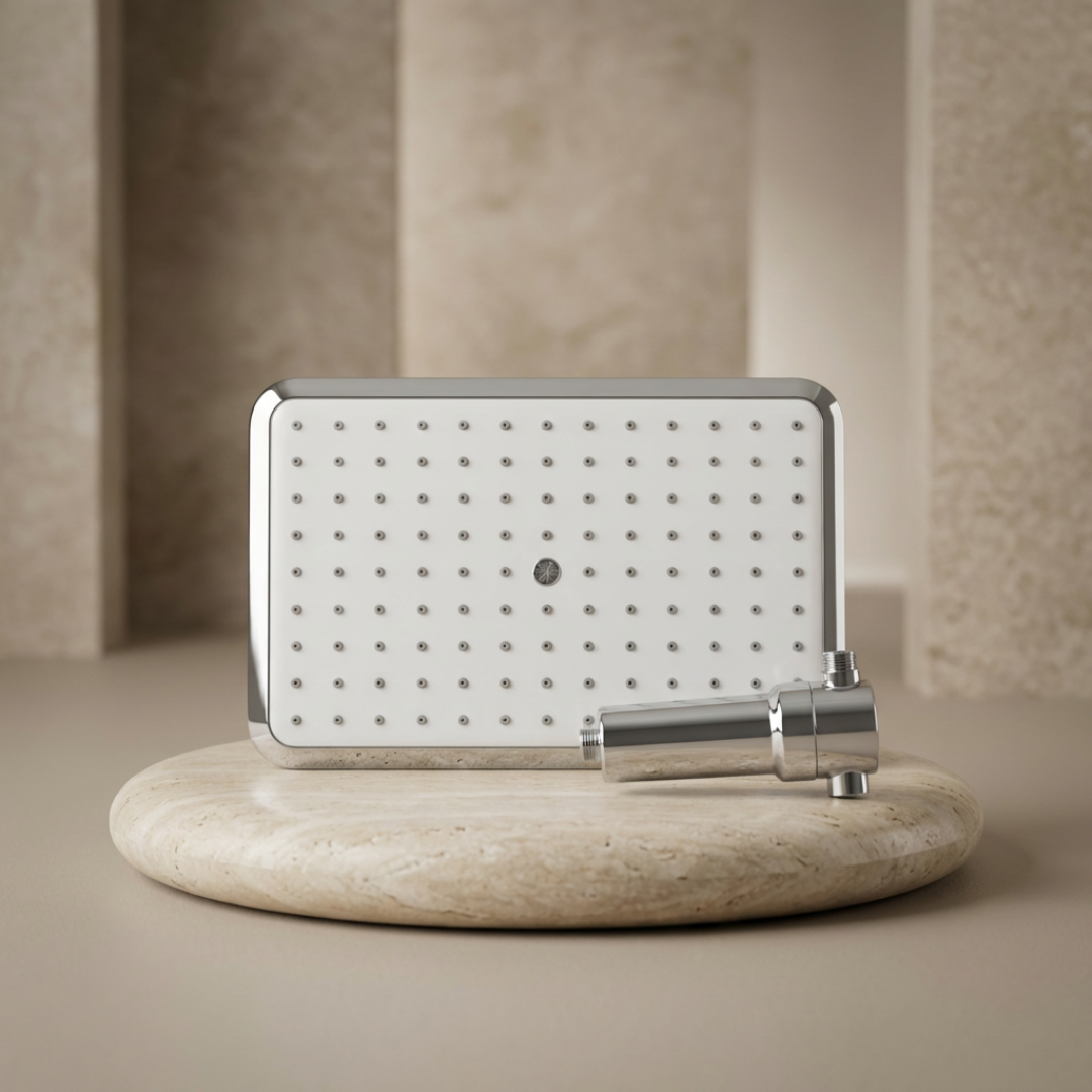 SUHAE uses Vitamin C infusion to help neutralise chlorine instantly as water flows through the system. This chemical reaction converts chlorine into less reactive compounds before the water touches your skin, making the shower feel gentler and more comfortable.