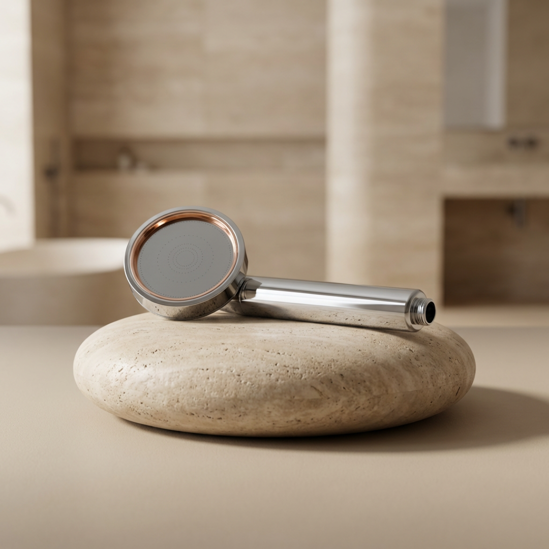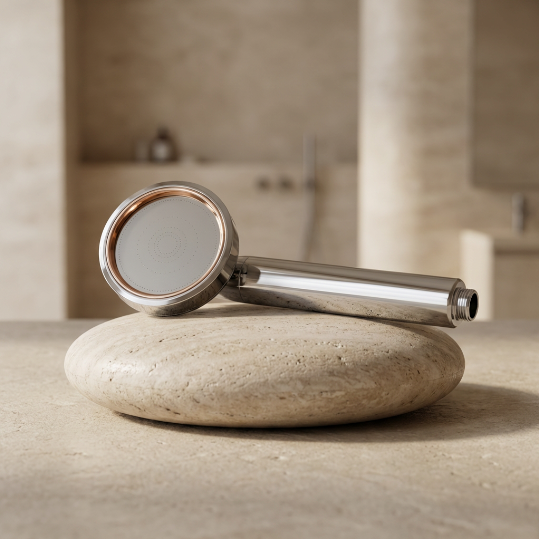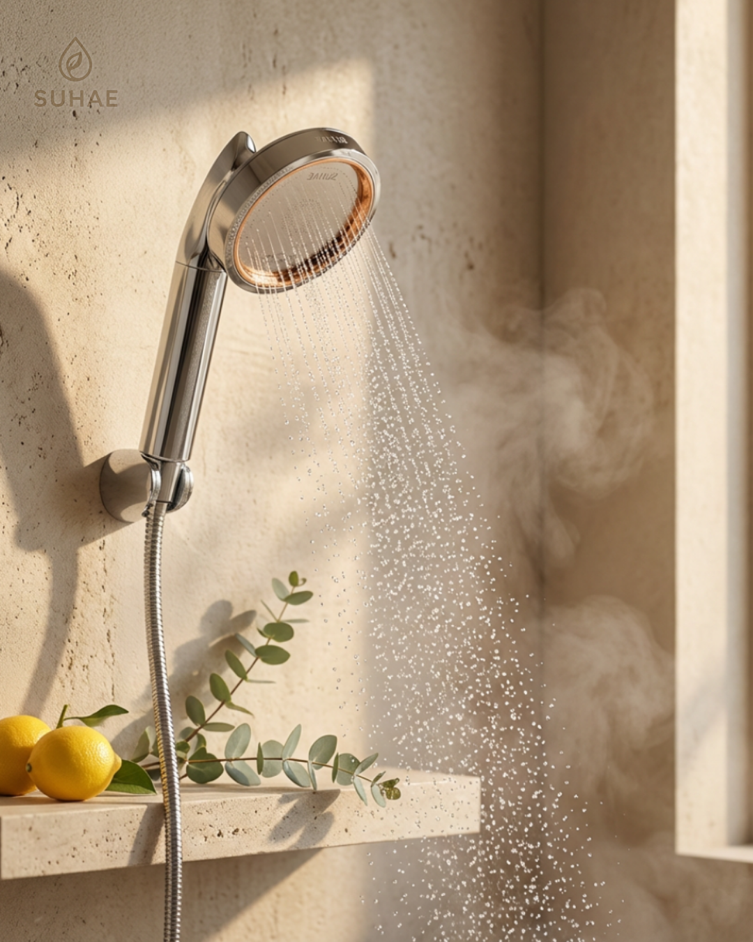SUHAE uses Vitamin C infusion to help neutralise chlorine instantly as water flows through the system. This chemical reaction converts chlorine into less reactive compounds before the water touches your skin, making the shower feel gentler and more comfortable.